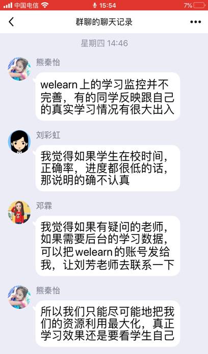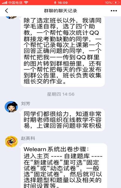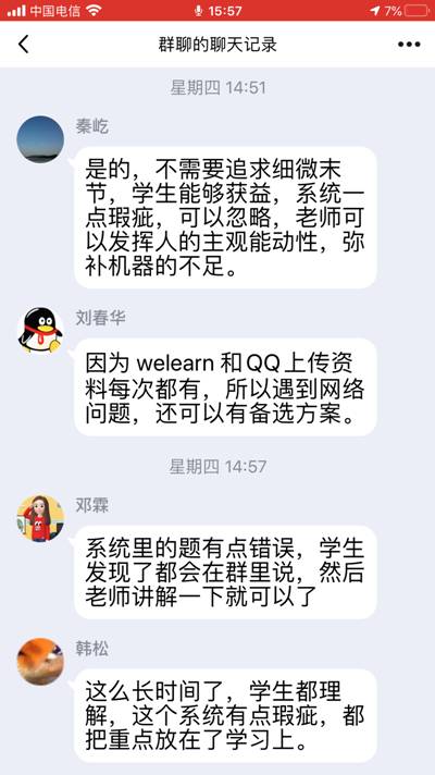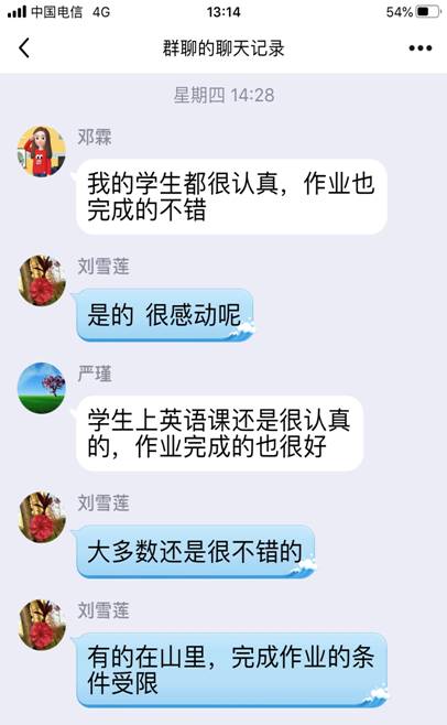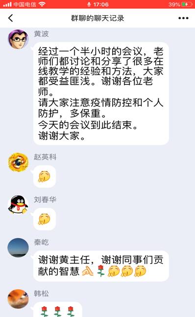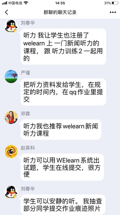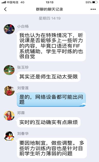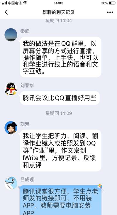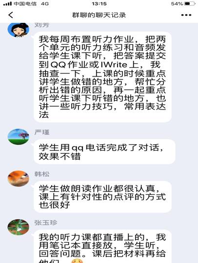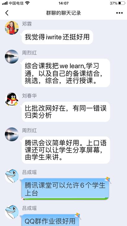 接着,老师们纷纷加入讨论,积极分享了自己所使用的在线教学软件,比如:腾讯会议、QQ电话、腾讯课堂、口语FiF系统、QQ作业等,就各种软件的使用方法和局限性,老师们各抒己见,建言献策。