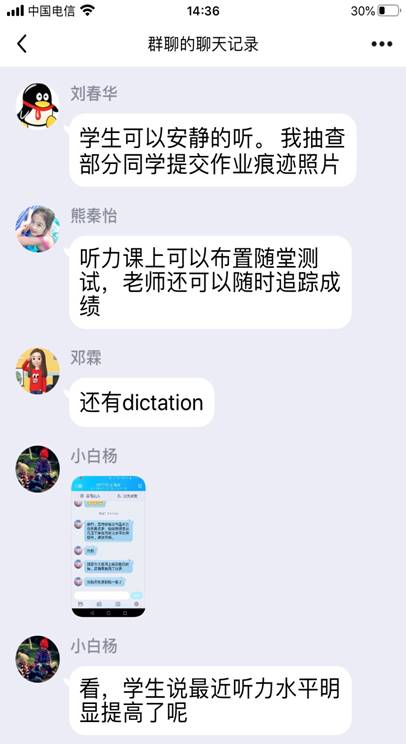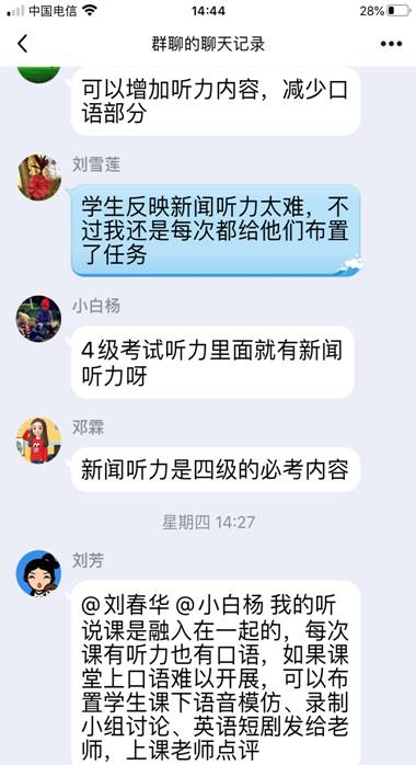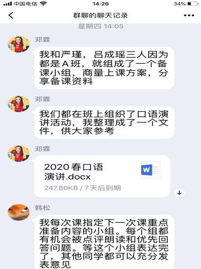 随后,老师们就口语和听力教学进行了交流。教研室副主任邓霖老师首先分享了A班口语教学方案,韩松老师介绍了分组练习和全班互动模式,严瑾老师建议使用“QQ电话”进行口语对话。在听力教学方面,老师们一方面布置学生自主学习We Learn随行课堂上的新闻听力内容,一方面使用国家级规划教材《新世纪听力训练2》的扫描件和音频文件给学生上课,学生把自己做的听力练习答案上传到iWrite系统里或拍照发到QQ作业中。虽然老师们给学生布置的听力练习较多,学生们都不折不扣地完成了,老师们针对学生做错的地方重点讲解,学生反馈说听力提高了不少。