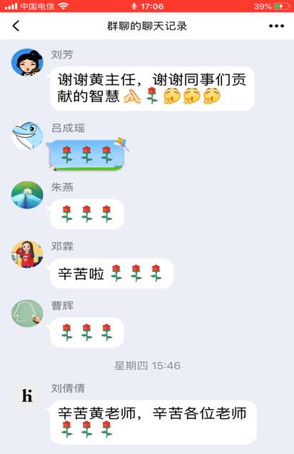 在线英语教学有其自身的局限性,比如,全体师生不能面对面互动,网络有时拥堵不畅,音视频易于卡顿,师生只能键字交流等等。尽管如此种种,绝大部分学生学习态度端正,自觉性和自律性较强,老师们勇于接受挑战,乐于分享交流,相信在线教学能够实现效率效果最大化。本次分享会持续一个半小时,结束之际,大家表示这次会议非常成功,感觉受益匪浅,互相感谢彼此贡献的智慧。