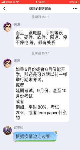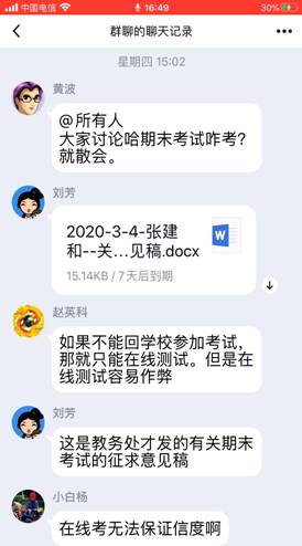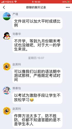 最后,老师们围绕在线期末考试何时进行、如何进行、不可控因素以及平时成绩构成和占比等问题进行了热烈讨论。考虑到很难保证远程在线测试的信度和效度,老师们认为,如果5、6月份学生能够返校,期末考试可以按原计划进行;如果学生届时不能返校,建议期末考试延期至9、10月份正常开学之时进行。