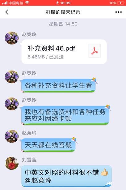 关于读写译教学,老师们反映,虽然WE Learn随行课堂也有瑕疵,但是不影响同学们主动学习。赵竞玲老师分享了附有中文翻译的英文阅读材料。刘芳老师介绍了如何借助学生助教的力量加强在线教学管理。赵英科老师分享了如何利用WE Learn 随行课堂进行在线测试。