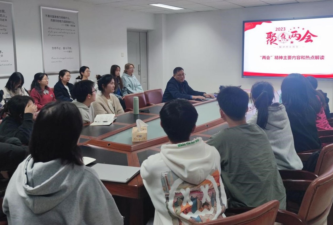 在重温入党誓词后,由刘世勇带领大家集体学习两会精神。他从两会的来龙去脉、两会热点重点聚焦和习近平总书记两会期间讲话精神三个方面进行了交流。他首先介绍了人民代表大会制度、两会历史、人大和政协的性质、职权职能、任期和一些不同称谓;接着围绕两会十大热词、政府工作报告的重点内容,聚焦中国式现代化、机构改革、化解风险改善民生重点解读;最后介绍了习近平总书记在全国两会期间参加江苏代表团审议和民建、工商联界联组会以及出席十四届全国人大一次上的重要讲话精神。在学习过程中,大家还围绕创新人才培养、大学生就业等进行了交流。他说,学习两会精神要与学习党的二十大精神结合起来,与日常工作生活结合起来,与成长成才结合起来,才能学深悟透学出效果。