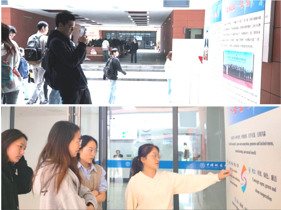此次活动展板内容丰富,包含“一带一路”倡议简介、习近平总书记关于“一带一路”的重要讲话节选、共建“一带一路”在硬联通、软联通、心联通方面的成果等内容,以权威的表述、生动的展示、详实的数据多方面展现了“一带一路”十年来的伟大成果。双语展览也延续了学院以专业素养服务红色文化国际传播的优良传统,通过查证、翻译、审校英译文本,各位学生党员通过专业训练既加深了对习近平外交思想的理解、提升政治素养,也激发了学以致用、专业报国的使命感。