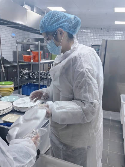 志在心中,愿在行动。在工作人员的引导下,志愿者们被分成四组,分别负责拖地、收纳餐具、清理桌面以及清洗餐具的相关工作。身着工作服,头戴防尘帽,他们将杂乱的餐具递进洗碗机,一丝不苟地清理桌面,肮脏的地面也在他们的助力下重换新颜。