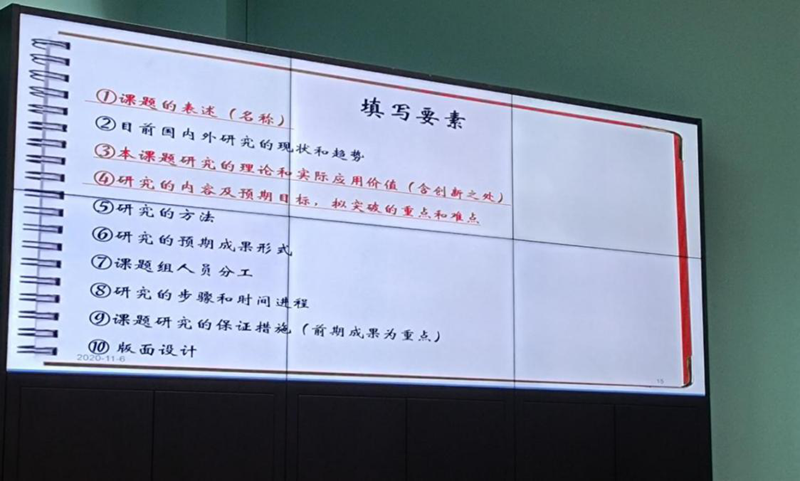 最后,在申请书填写方面,黄教授详细讲解了十大填写要素:课题的表述(名称)、国内外研究的现状和趋势、本课题研究的理论和实际应用(含创新之处)、研究的内容及预期目标、拟突破的重点和难点、研究的方法、研究的预期成果形式、课题组人员分工、研究的步骤和时间进程、课题研究的保护措施(前期成果为重点)、版面设计。黄教授将上述要素总结为申报项目中的“3驾马车加4大法宝”的模式,即课题名称、重难点、创新点与多看,多总结、多想、多交流。
