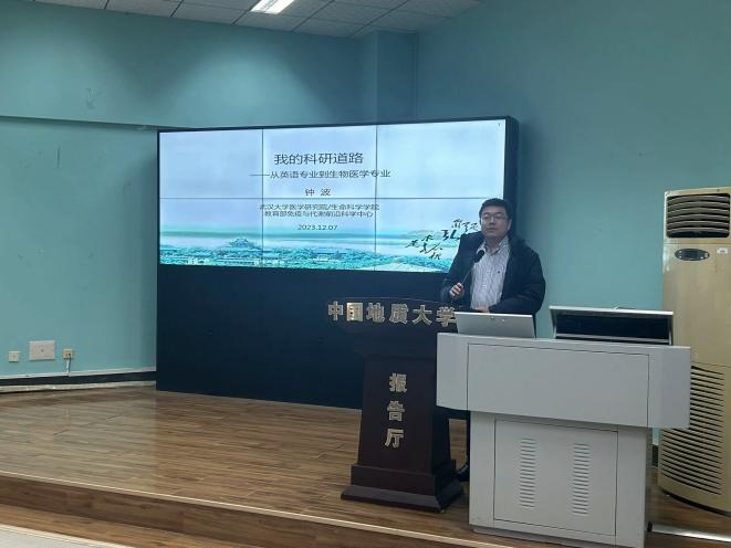 首先,杨红燕老师进行开场致辞,简要介绍了主讲人钟波教授,并对其到场表示了热烈的欢迎。讲座开始后,钟教授以自身高考经历为切入点,分享了他在地大的求学经历。通过不断探索和尝试,钟教授对生物医学逐渐产生了浓厚的兴趣。通过“七校联合办学”项目,钟教授参加了武汉大学生物科学专业的第二学位课程。大学毕业后,钟教授决定继续在生物医学领域深造,考取了武汉大学细胞生物学专业的研究生,师从中国科学院舒红兵院士。