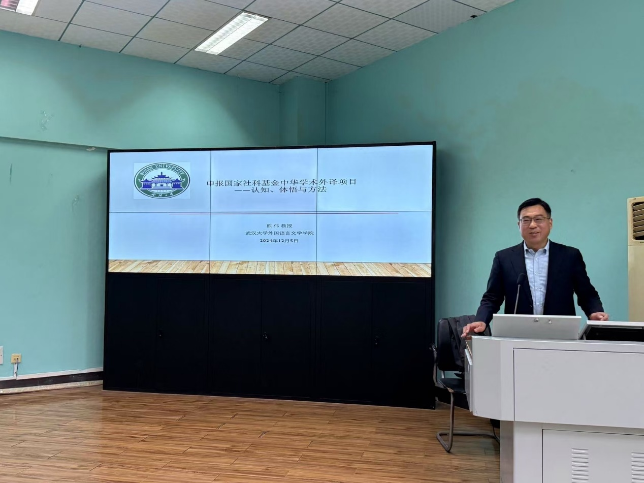 (通讯员/摄影 王晓)2024年12月5日上午9:00,WilliamHill中文官方网站(武汉)“南望今声”外语论坛系列讲座第七十二期在北一楼学术报告厅召开。主讲人为熊伟教授,应邀来到WilliamHill中文官方网站开展了主题为“申报国家社科基金中华学术外译项目:认知、体悟与方法”的精彩讲座。此次讲座由张峻峰院长主持,参会人员有相关专业老师以及全体研究生。