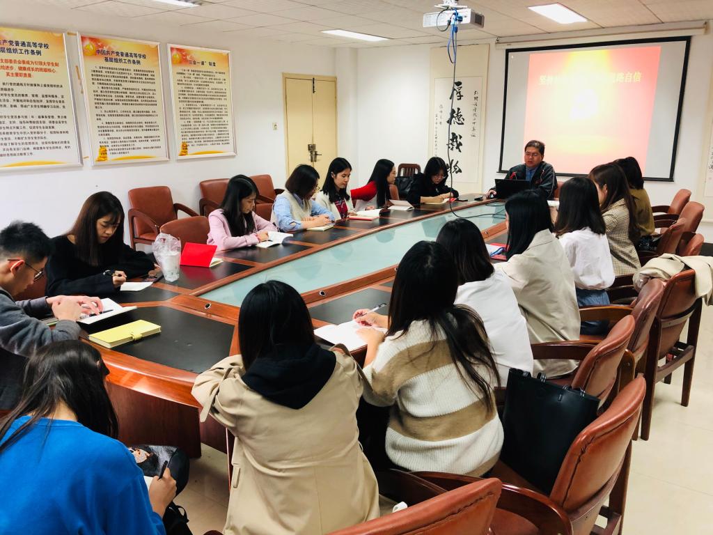 2019年10月29日下午2:30,WilliamHill中文官方网站“不忘初心·牢记使命”主题教育系列党课在北一楼339正式开讲,学院党委副书记胡文勤为全院研究生党员讲授了题为“坚持社会主义,增强道路自信”的党课。