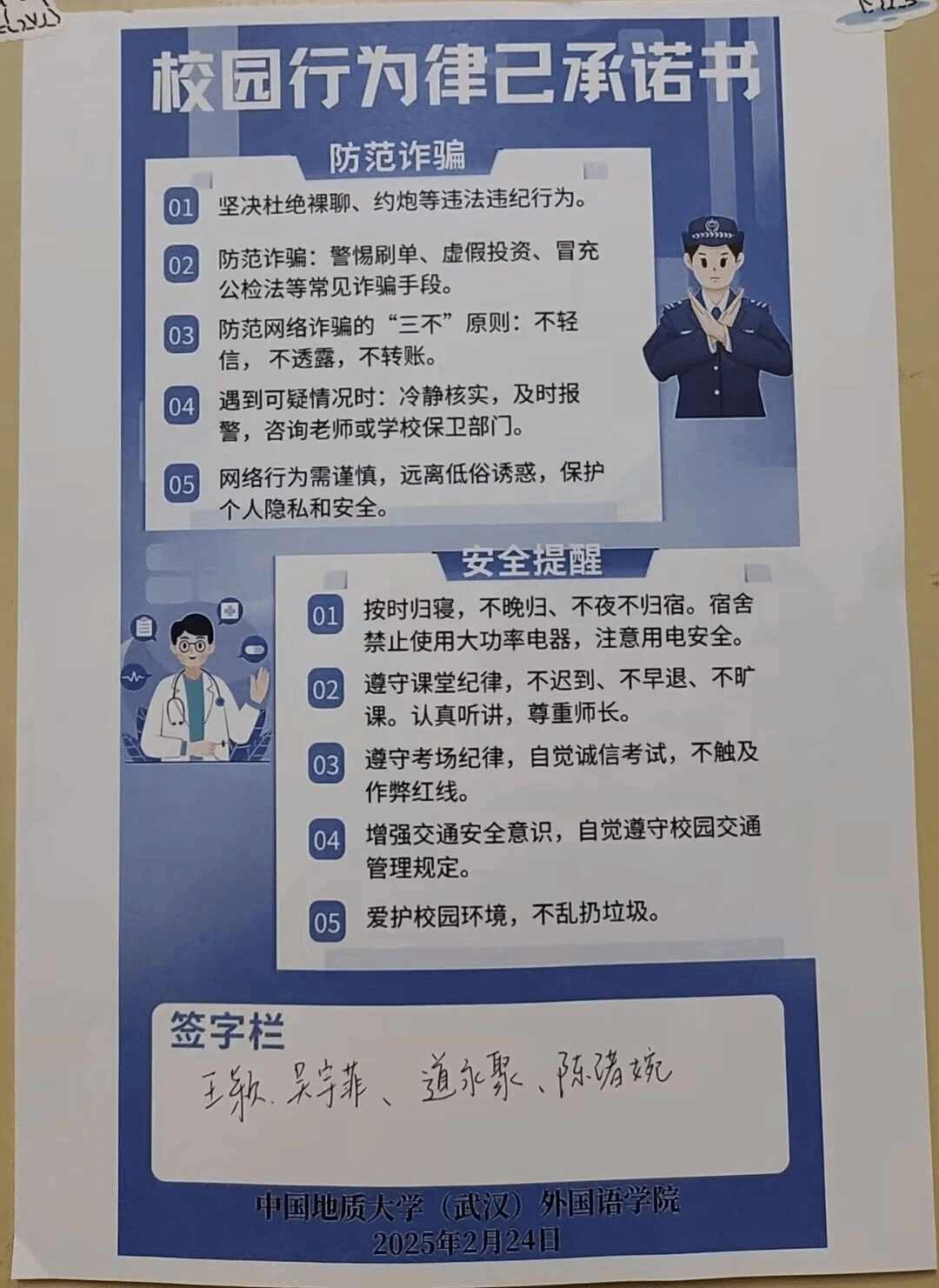 活动中,WilliamHill中文官方网站团委学生会和研究生会近期面向全体本研学生发放校园律己行为承诺书,全面覆盖外院学子所在的每一个寝室。承诺书内容涵盖校园行为规范、宿舍安全管理、课堂纪律管理、网络诈骗防范等校园生活的多个方面。通过这一系列多样化活动形式,有效提升了学生的安全意识,切实培养了学生的自律意识,营造了良好的宿舍氛围,确保了校园生活的安全与秩序,激励着外院学子在新学期继续追逐自己的学习目标。