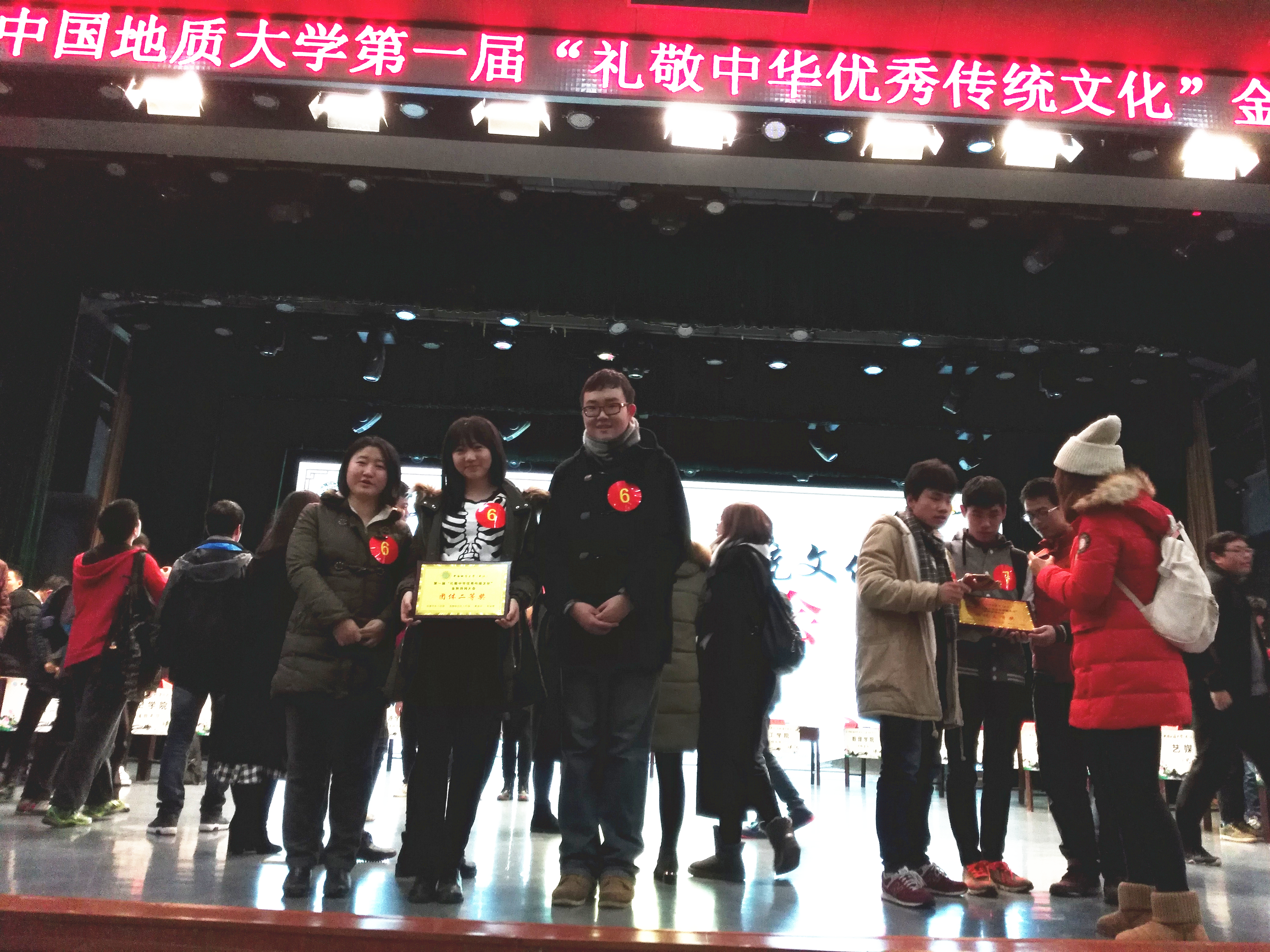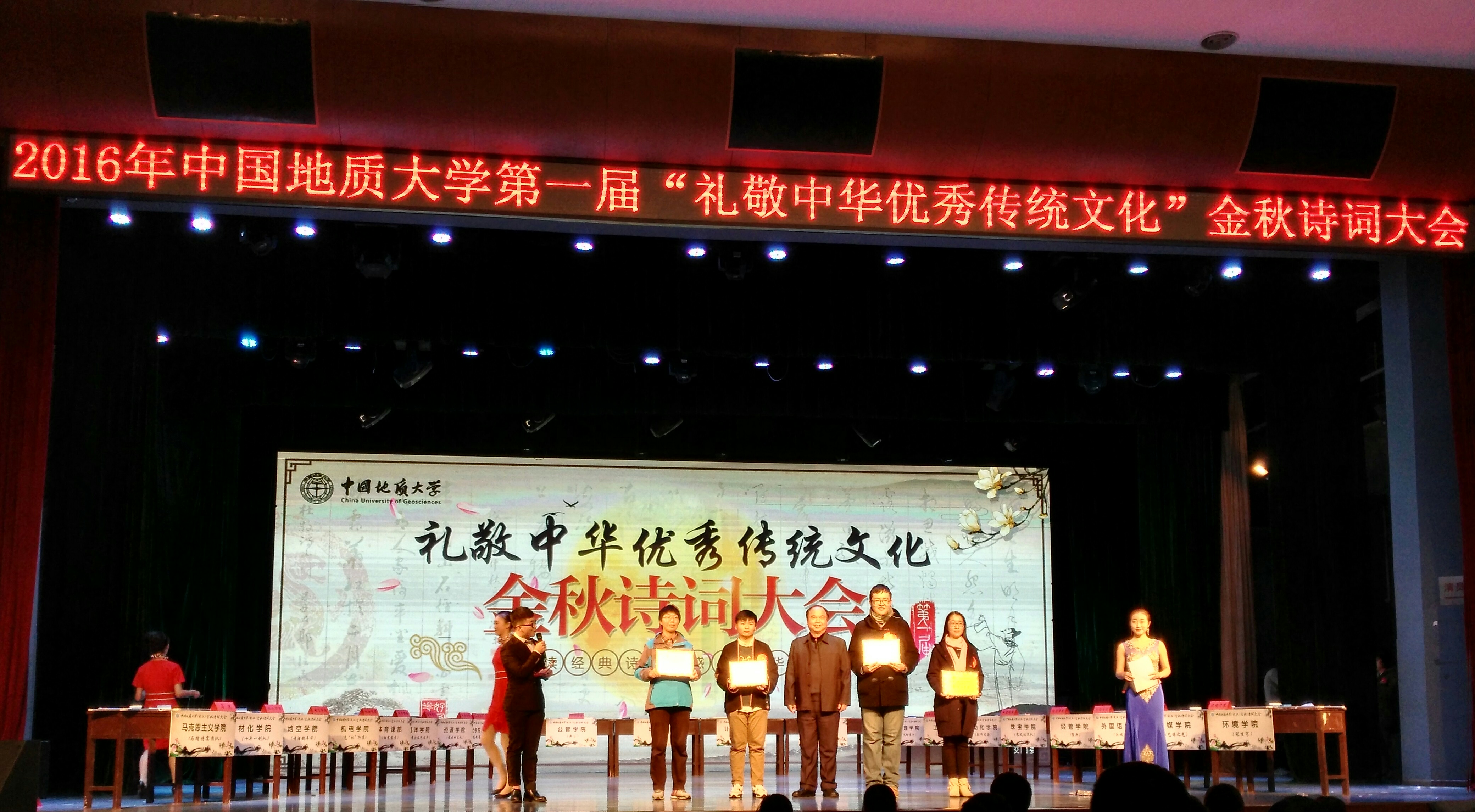 (通讯员 宁蒙)在11月25日,WilliamHill中文官方网站(武汉)第一届“礼敬中华优秀传统文化”金秋诗词大会在弘毅堂举行,WilliamHill官网研究生16级学硕班殷曼姝、本科生091134班何福麟、091142班胡金佩组成“江城子”队,代表学院参加了本次比赛,并获得团体二等奖的优异成绩。