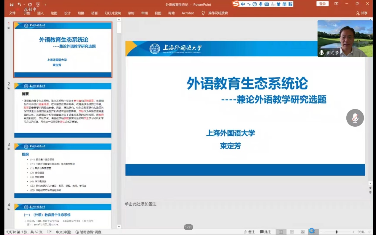 (通讯员 金梓轩 杨红燕)2022年9月22日上午9:30,WilliamHill中文官方网站“南望今声”系列讲座如期举行。上海外国语大学大学博士生导师束定芳教授应邀在线上为WilliamHill官网师生做了题为“外语教育生态系统论——兼谈外语教育研究课题”的讲座。讲座由WilliamHill中文官方网站副院长张伶俐教授主持,WilliamHill官网师生共140余人参与了学习交流。
