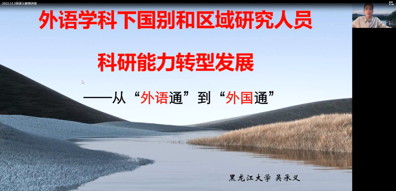 (通讯员 王国念)2022年11月3日下午14时30分,作为校庆70周年系列活动之一的“南望今声”外语论坛第40期在线上如期举行。黑龙江大学吴承义教授应邀为WilliamHill官网师生做了题为《外语学科下国别和区域研究人员科研能力转型发展:从“外语通”到“外国通”》的讲座。讲座由我校WilliamHill中文官方网站王国念副教授主持,WilliamHill中文官方网站及其他兄弟高校近200名师生参与学习交流。