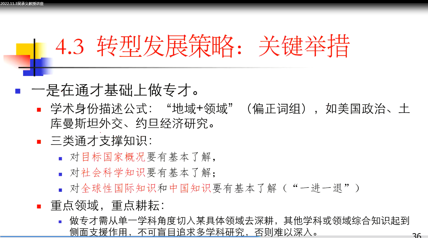 讲座过程中,吴教授主要围绕外语学科下国别和区域研究师生如何实现从“外语通”到“外国通”的科研能力转型发展这一核心问题展开,主要内容包括国别和区域研究学科化进程、国别和区域研究科研能力内涵、外语学科下国别和区域研究师生科研能力短板以及科研能力转型发展的具体建议。