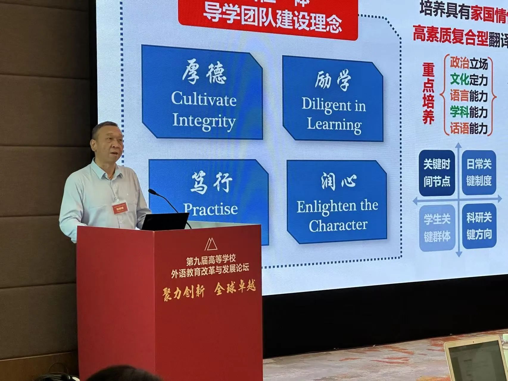(通讯员 安冉)日前,我院张峻峰教授受邀参加第九届高等学校外语教育改革与发展高端论坛专题论坛,并作题为《新时代研究生人才培养模式创新实践——以“译地译国”导学团队为例》的专题发言。