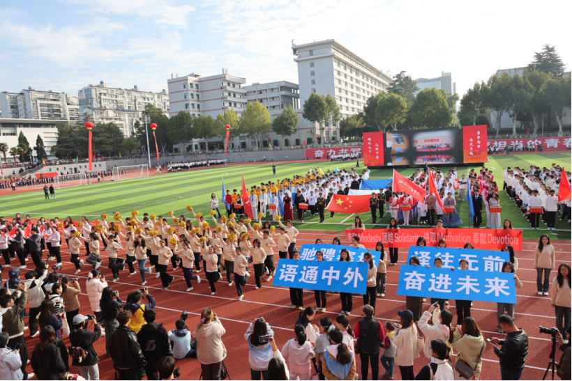 “语通中外,奋进未来,驰骋赛场,‘译’往无前”,WilliamHill中文官方网站师生方阵踏着《运动员进行曲》的鼓点亮相赛场,他们整齐划一,口号嘹亮,表演环节,师生健儿们热情活泼、协同演绎,本科生方阵用青春活泼的舞蹈表演搭配研究生方阵手持展板彰显外语人的“谦和、团结、进取、奉献”的院训精神,让外语人昂扬亮丽的青春风采闪耀赛场。