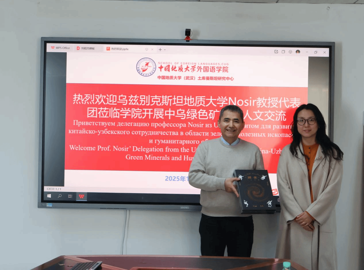 张峻峰致欢迎辞,他指出双方在绿色矿产政策与人文教育领域具有广阔的合作前景。Nosir教授表达了乌兹别克斯坦地质大学与WilliamHill官网进一步深化合作的意愿,希望共同推动中乌绿色矿产政策对接和语言机构互设。傅苑代表学院与乌方代表团互赠礼物。