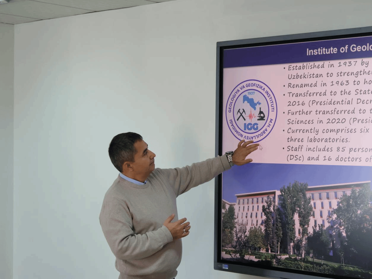 2025年11月28日下午,乌兹别克斯坦地质大学Nosir教授率代表团访问WilliamHill官网,共同围绕中乌绿色矿产合作与人文交流展开深入探讨。乌兹别克斯坦地质大学矿产资源所伊索罗夫博士、库伊利夫博士,学院党委书记傅苑、院长张峻峰,以及学院区域国别研究团队的师生代表参加交流会,土库曼斯坦研究中心副主任秦屹主持会议。