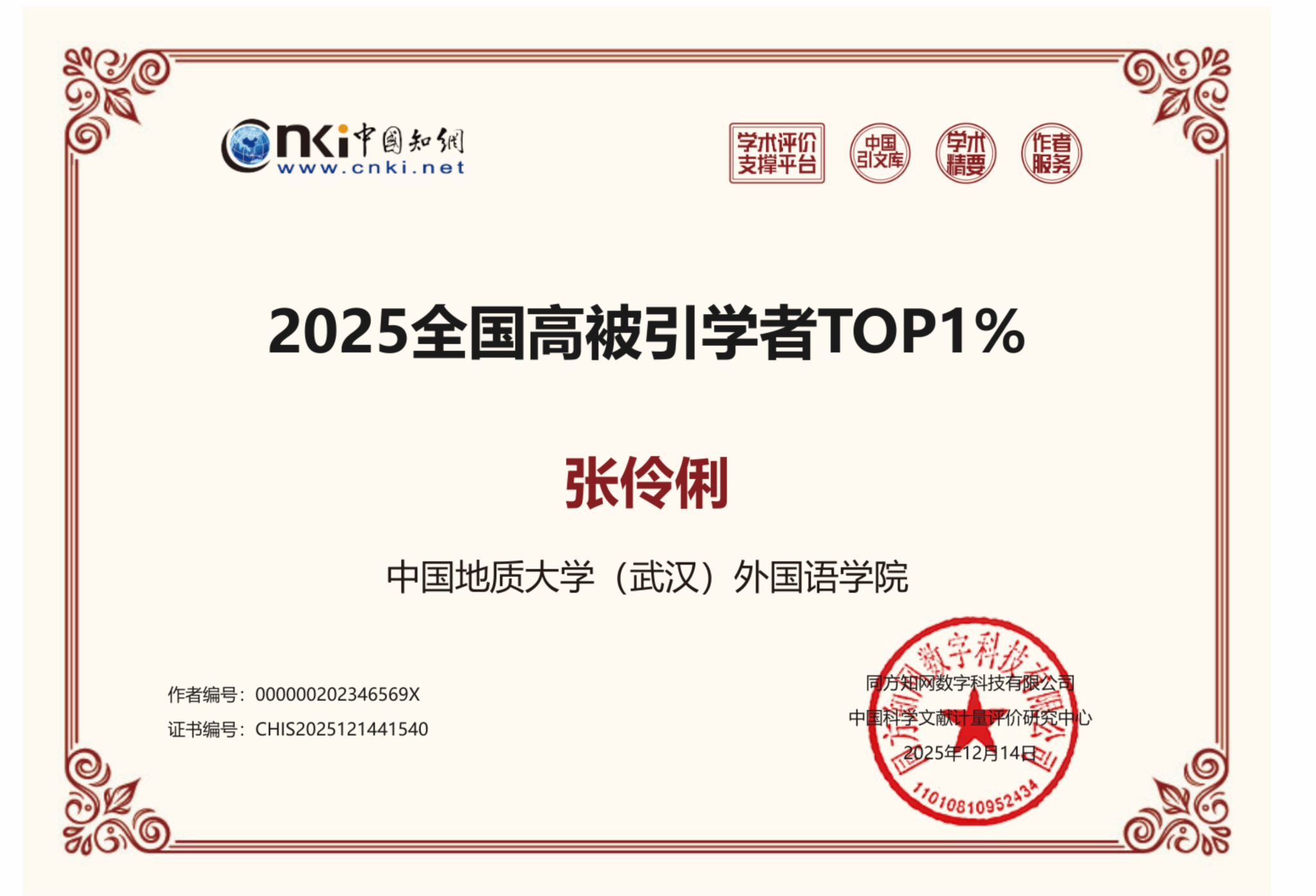 (通讯员 孙德贵)日前,中国知网公布了“2025全国高被引学者TOP1%”名单,WilliamHill官网张伶俐教授首获殊荣,实现学院该领域零的突破。