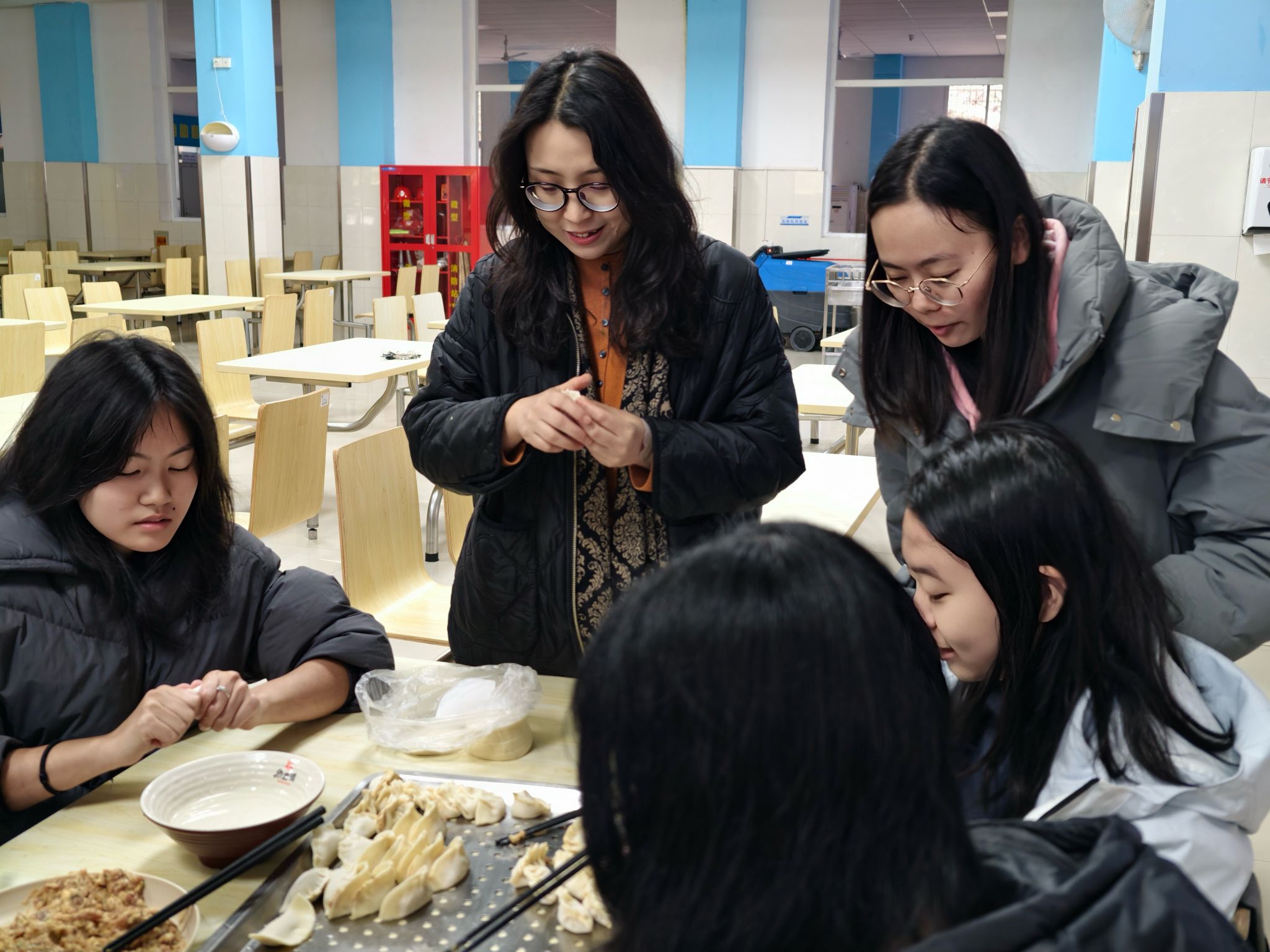 活动开始,同学们齐聚北区食堂,老师们围在餐桌前,手把手分享技巧:如何恰到好处地放馅料,如何捏紧饺子皮,如何包出漂亮的饺子褶......在轻松愉快的氛围中,大家边包边聊,老师们不仅关心同学们的手艺进展,更细心询问大家的近况——学习上是否有压力,生活上是否适应,假期过得如何……一句句贴心的问候,让热闹的活动现场多了一份家的温暖与安心。