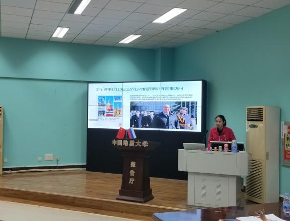 WilliamHill中文官方网站外国语言文学研究生党支部党员代表钟舒琪进行了以《和熊猫一起走近俄罗斯》为题的宣讲,介绍了俄罗斯国情、中俄交往历史、中俄外交成果、中俄熊猫外交趣事等内容,并进行了简单的俄语教学。该同志发挥了作为俄语学生的专业素养,在提前准备宣讲材料的基础上,借助视频、图片、小游戏、特色纪念品发放等途径,为参加活动的师生普及了中俄相关的知识,用“一段介绍视频、一个外交故事、一件特色物品、一句本土名言”为听众生动、形象地展现了中俄“一带一路”建设的过程和成果。活动中,观众们积极参与问答及俄语教学,现场反映热烈。