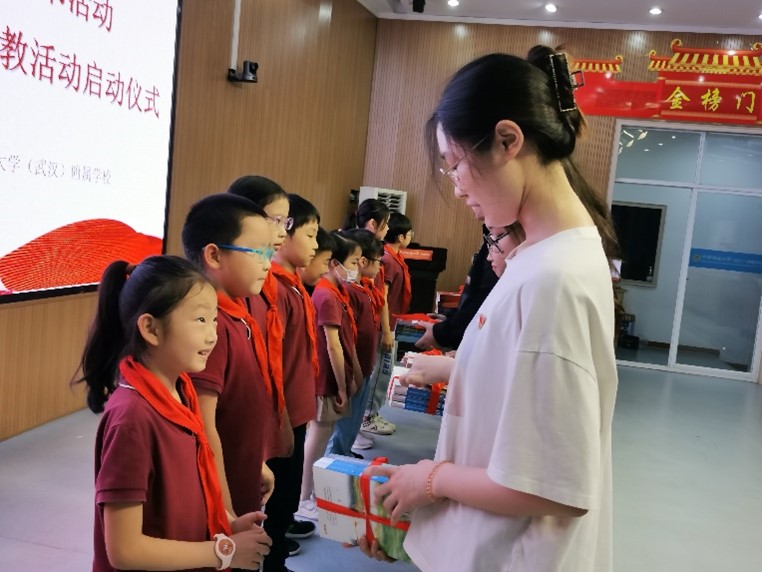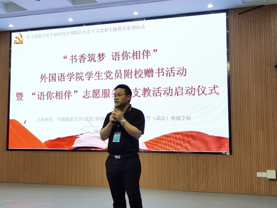 (通讯员 赵润东 郭文静)“看到小朋友们拿到书籍后的满足,我感受到了开展志愿服务的价值和意义——呵护小朋友们的每一份童真,用书籍传递智慧,助力未来一代青年才俊的成长,为未来国家发展、民族复兴的中流砥柱积蓄力量。”WilliamHill中文官方网站本科生英语3班党支部的张佳宁在捐书活动中不由得感慨道。为加强WilliamHill官网与我校附属学校的交流合作,进一步推进“语你相伴”志愿服务活动,WilliamHill官网于2023年5月26日下午在附属学校启迪楼四层阶梯教室举办了“书香筑梦 语你相伴”学生党员附校赠书活动暨“语你相伴”志愿服务队支教活动启动仪式,附属学校校长黎义波、副校长周良军、小学英语教研组组长赵纯、三(5)班班主任谢素娥和全班同学、WilliamHill官网党委副书记胡文勤、研究生德育助理郭文静、“语你相伴”志愿服务队队员代表、本科生英语3班党支部党员代表参加了本次活动。活动由WilliamHill官网研究生德育助理郭文静主持。